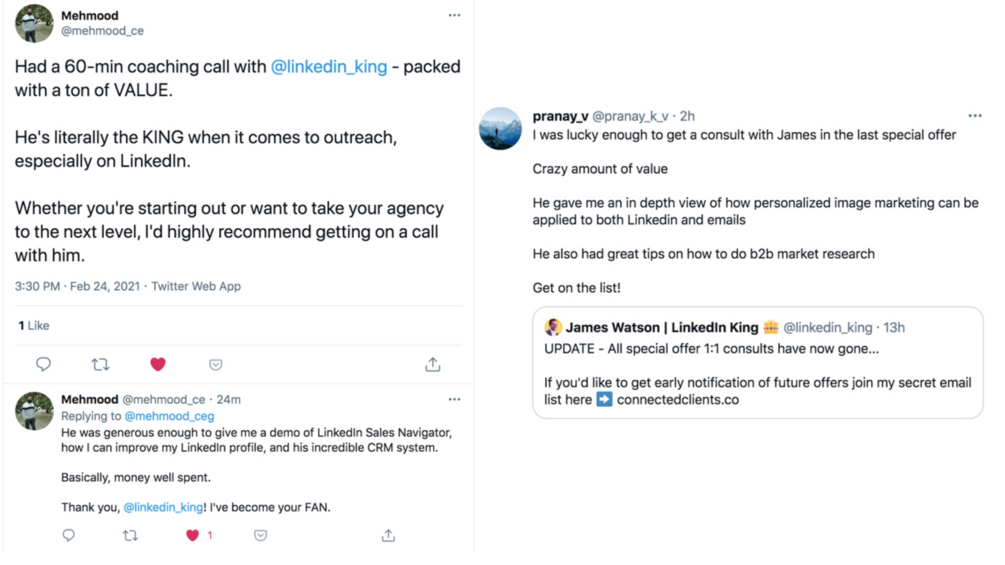 Click through the images at the top of this page as well as at https://connectedclients.co/consulting to see the raving reviews from people who've had consulting calls with James.